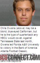 Chris Owens may be a blond, blue-eyed Californian, but he is the type of quarterback any HBCU would covet. Against Tennessee State last month, Owens led Florida A&M University to victory in the Bank of America Atlanta Football Classic, completing 19 of 30 passes for 226 yards, one touchdown and zero interceptions. The impressive showing was enough to make Owens, a red-shirt freshman, the Mid-Eastern Athletic Conference’s Rookie of the Week.
