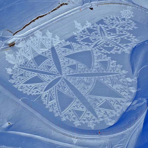 Simon walks over layers of fresh snow in special shoes to create his mind-boggling art.