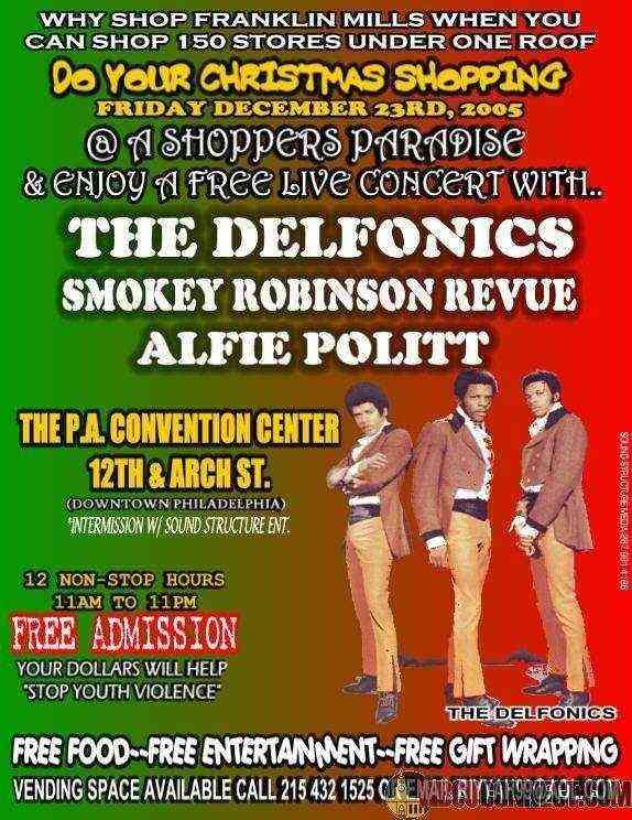 Hey come do your Xmas shopping and enjoy a free concert by the DELFONICS, the SMOKEY ROBINSON revue and ALFIE POLITT (formerly one of Teddy Pendergrass's musicians) plus free gift wrapping and free food. Plus a black singles MEET & GREET area. DEC. 23, 2005 @ PA Convention Center 12th & Arch Sts. in Philly