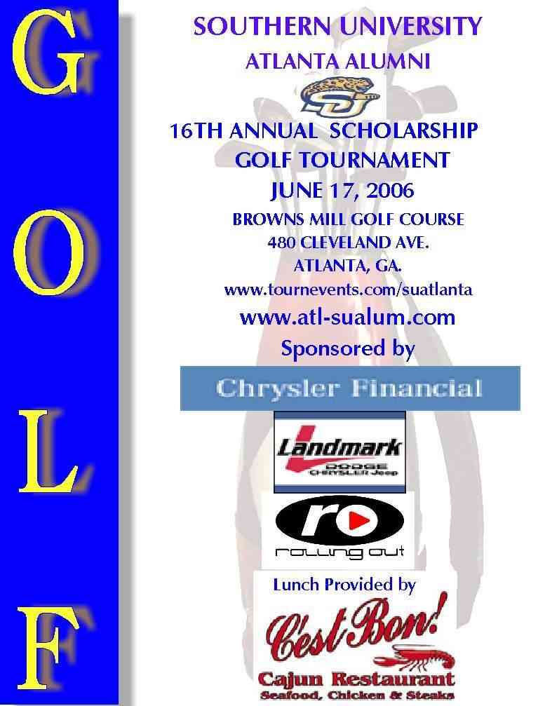 Please join us for a fun filled day of golf on Saturday June 17, 2006 at the Browns Mill Golf Course. Enjoy the fellowship as we raise funds to provide scholarships to deserving students in the Atlanta area. There will be contests, raffles, great prizes, continental breakfast, and lunch catered by C'est Bon Cajun Restaurant. Tee time is 8:00 a.m.