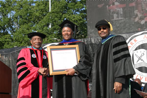 The Honorable Ambassador Charles R. Stith (center), director of the African Presidential Archives and Research Center at Boston University, receives an honorary degree from Clark Atlanta University President Walter D.
