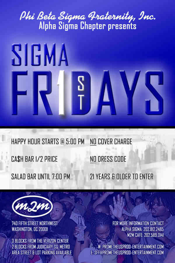 Come joint the Brothers of Phi Beta Sigma Fraternity Inc., Alpha Sigma Chapter as we present Sigma First Fridays. Soon to be come the premier social event hosted by Black Greeks in the Washington, DC Metropolitan area for the urban professional to foster social, business, and personal relationships to increase the quality of life.