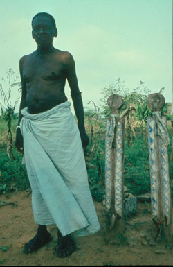 The blue and white kigango was carved as a memorial to one of the deceased brothers of Kalume Mwakiru, who owned the vigango.