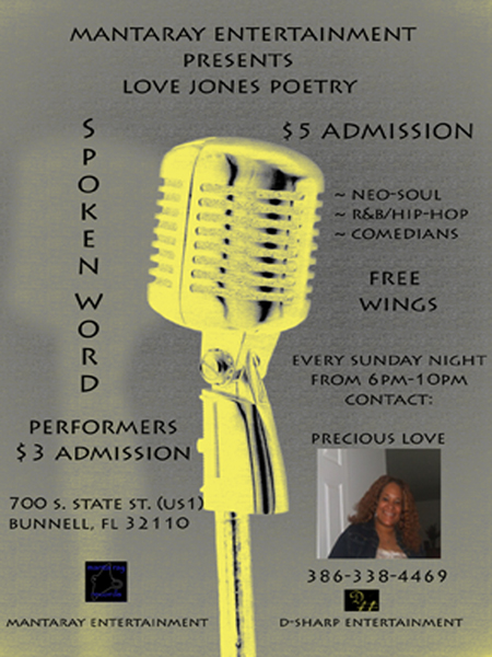 Spoken Word Artist, Precious Love is holding a venue in Palm Coast/Bunnell, FL (about an hour from Orlando, 30 minutes from Daytona Beach). Free wings...All performers $3 admission, guests $5 admission. A mixutre of spoken word, live bands, hip/hop groups, R&B, the famous Mr. Al Pete, etc. The first show is Nov. 11th on a Sunday from 6pm to 10pm. If interested in performing or RSVP, contact: Precious Love@386-338-4469.