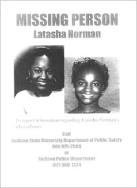 Anyone with information regarding Latasha Norman's whereabouts is asked to contact JSU's police department at (601) 979-2580 or the Jackson Police Department at (601) 960-1210.
