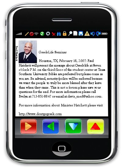 Houston, TX, February 18, 2008: Fred Hatchett will present the message about Greek-life at Seven o’clock P.M. on the third floor of the student center at Texas Southern University. Bibles are preferred but please come as you are. Be advised, security/police will be enforced because we want the people to truly be more blessed after they leave than when they came. This is not a forum please save your questions for the end. For more information please call Evelyn at 713-851-8847 or email at davis_med@yahoo.com.